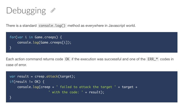 Oh, did I mention that the official Screeps documentation page includes - as an example of how players are supposed to use the console.log function - a code snippet that logs the name of an enemy creep?